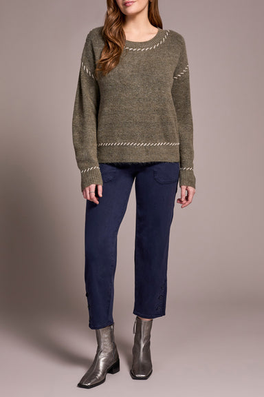 Wrap yourself in cozy charm with the Tribal Lena Crew Neck Sweater in ivy. Its wide neckline adds a flirty touch, while the fun stitching detail br...