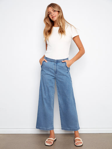 Effortless style meets comfort in these Charlie B wide leg jogger jeans. Crafted from soft denim in a gentle blue wash, they feature a cropped leng...