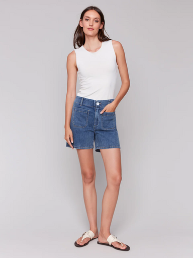 Experience comfort with our denim blue shorts. The clean look is achieved with no side seams, while the patch pockets add practicality. Crafted fro...