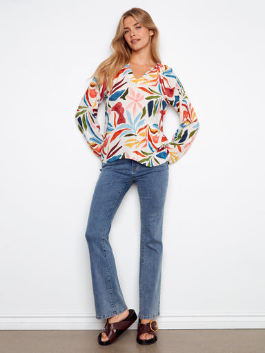 Embrace your bohemian spirit with this vibrant popover blouse. Designed with relaxed raglan sleeves and a flattering notched neckline, it offers an...