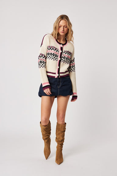 Elevate your cozy style with the John & Jenn Maxim Cardi in Blackcomb. This modern twist on the classic Fair Isle features a chic shawl collar ...