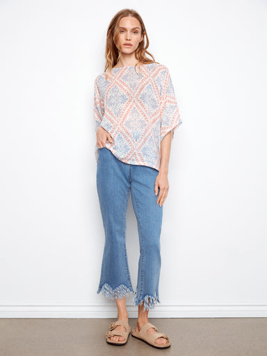 Effortless elegance meets vibrant style with this flowy boatneck blouse. Featuring a stunning trellis print in beautiful coral and blue tones, it's...