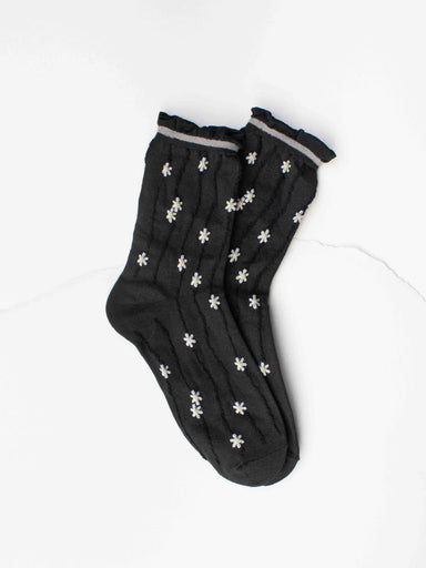Bring a sweet retro vibe to your outfit with our wavy daisy socks. Featuring delicate embroidered daisies along playful wavy stripes, these socks s...
