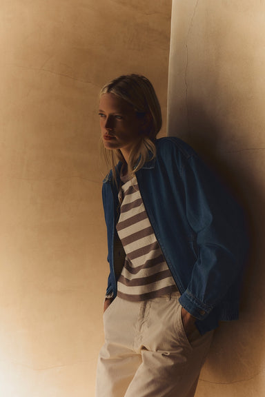 Elevate your wardrobe with the Velvet Maxine Cotton Tape Top. This stunning striped sweater features a unique tape yarn that adds texture and dimen...