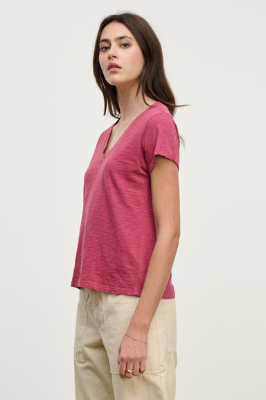 Expertly crafted with our original cotton slub, this tee offers a textured and soft feel, perfect for everyday wear. Its v-neckline and short sleev...